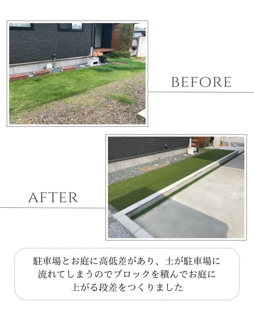 崩れやすかった駐車場とお庭の境目にタイルのついたブロックを入れてオシャレになりました✨
