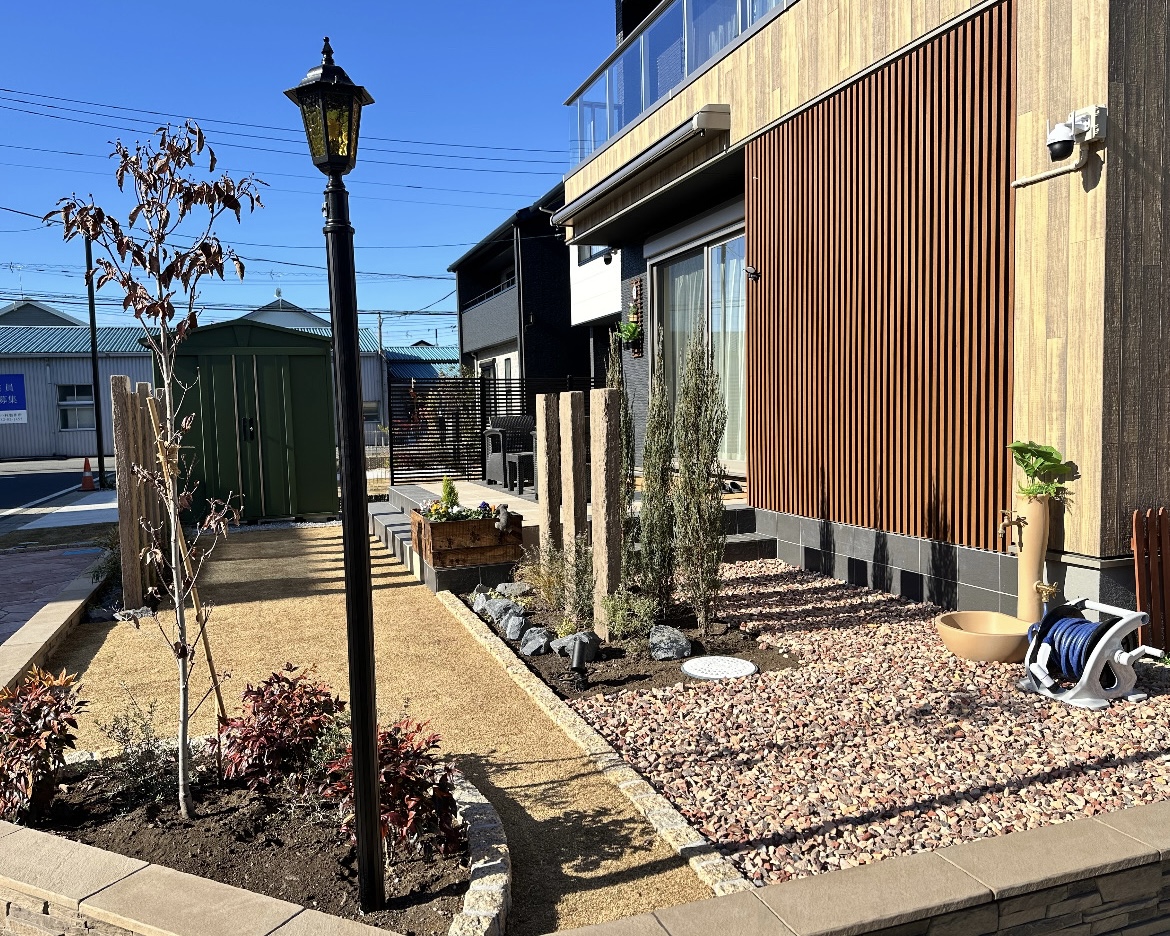 立派な建物に合わせたデザイン性の高い商材を組み合わせて、唯一無二の個性あふれる素敵な外観になりました。