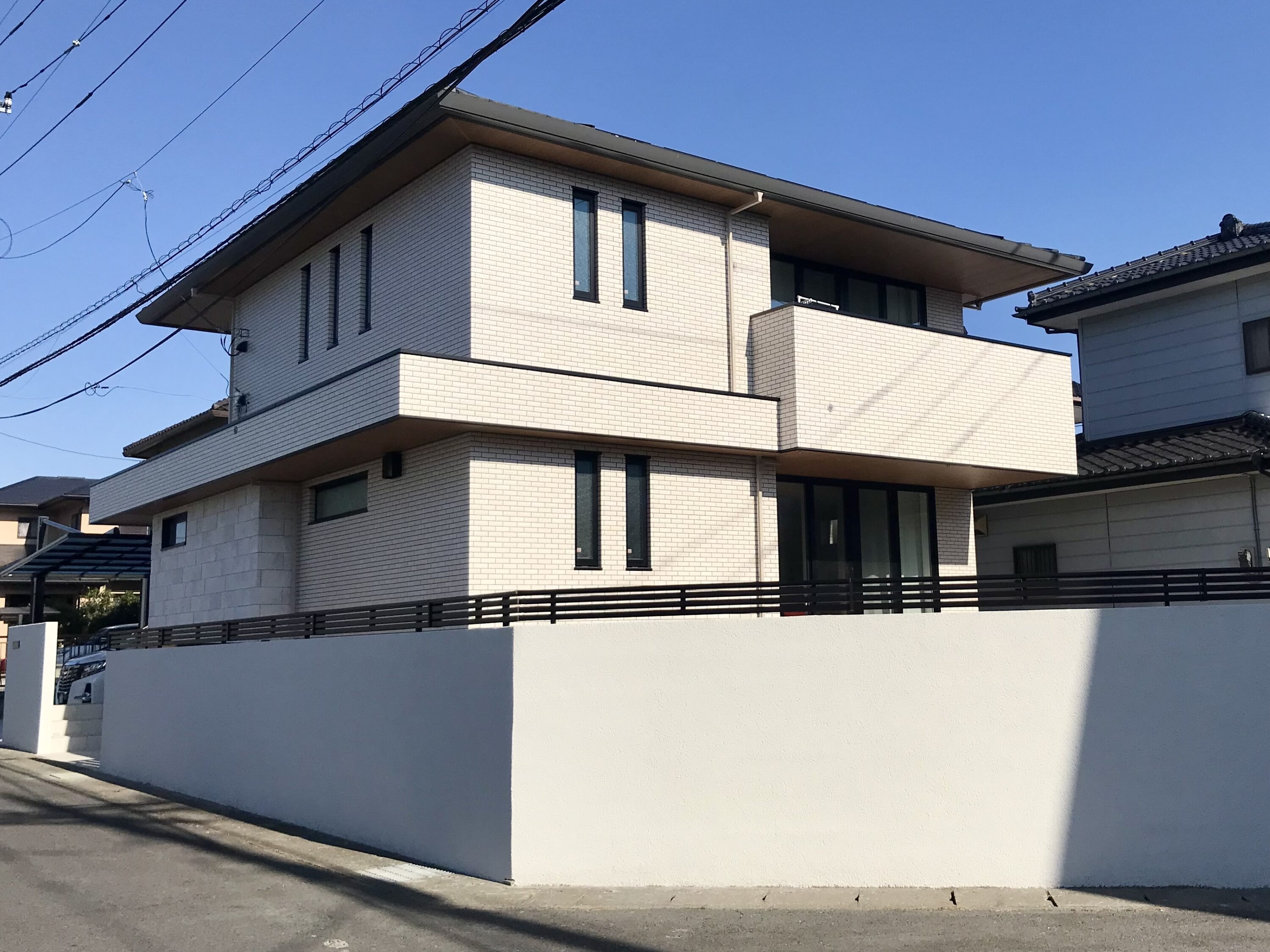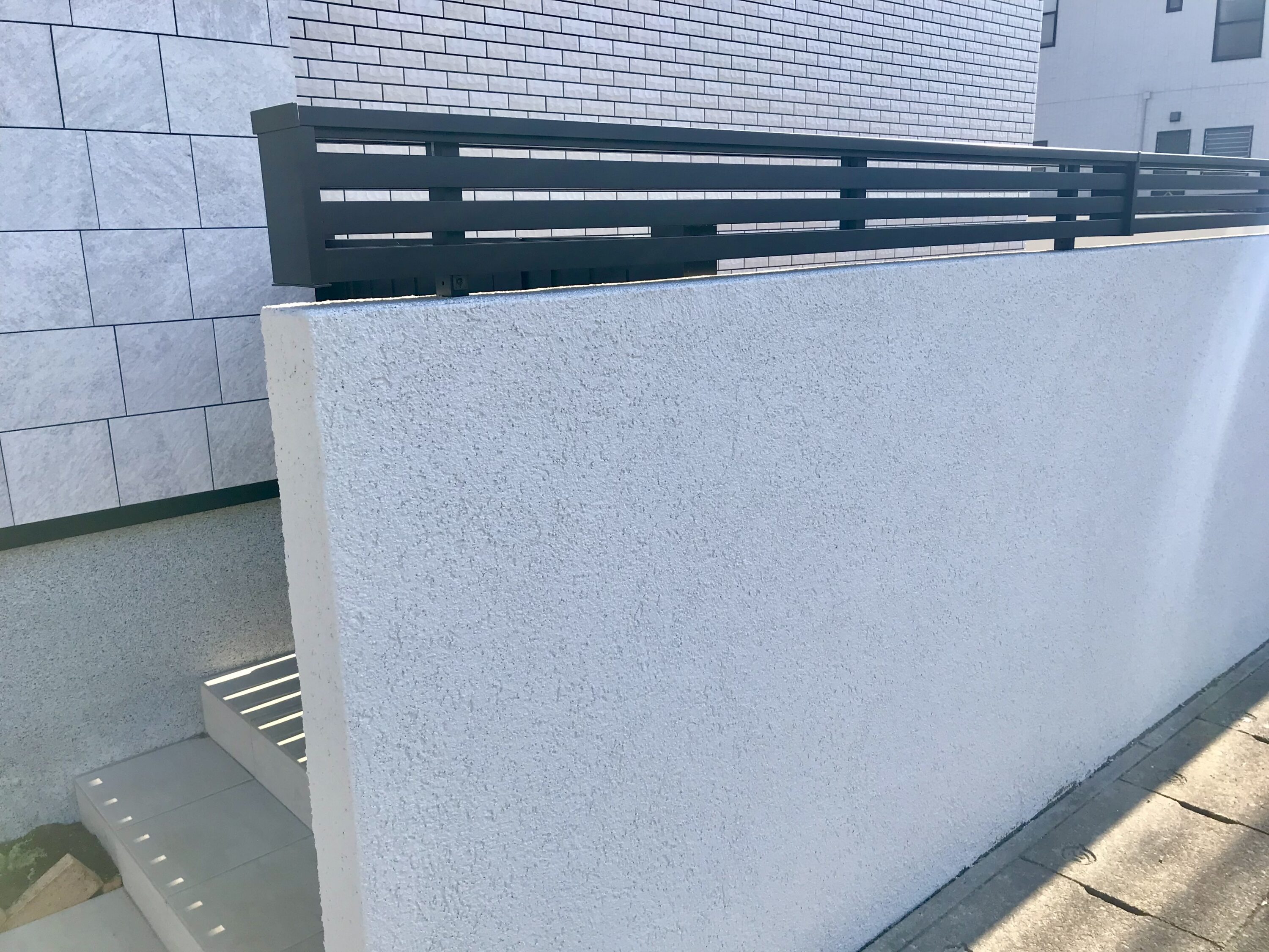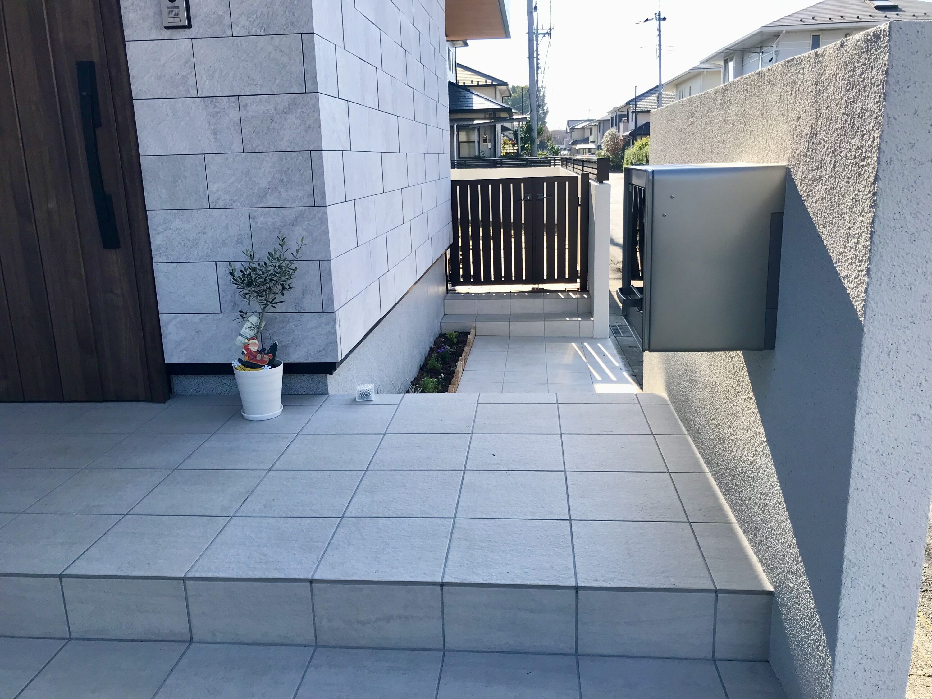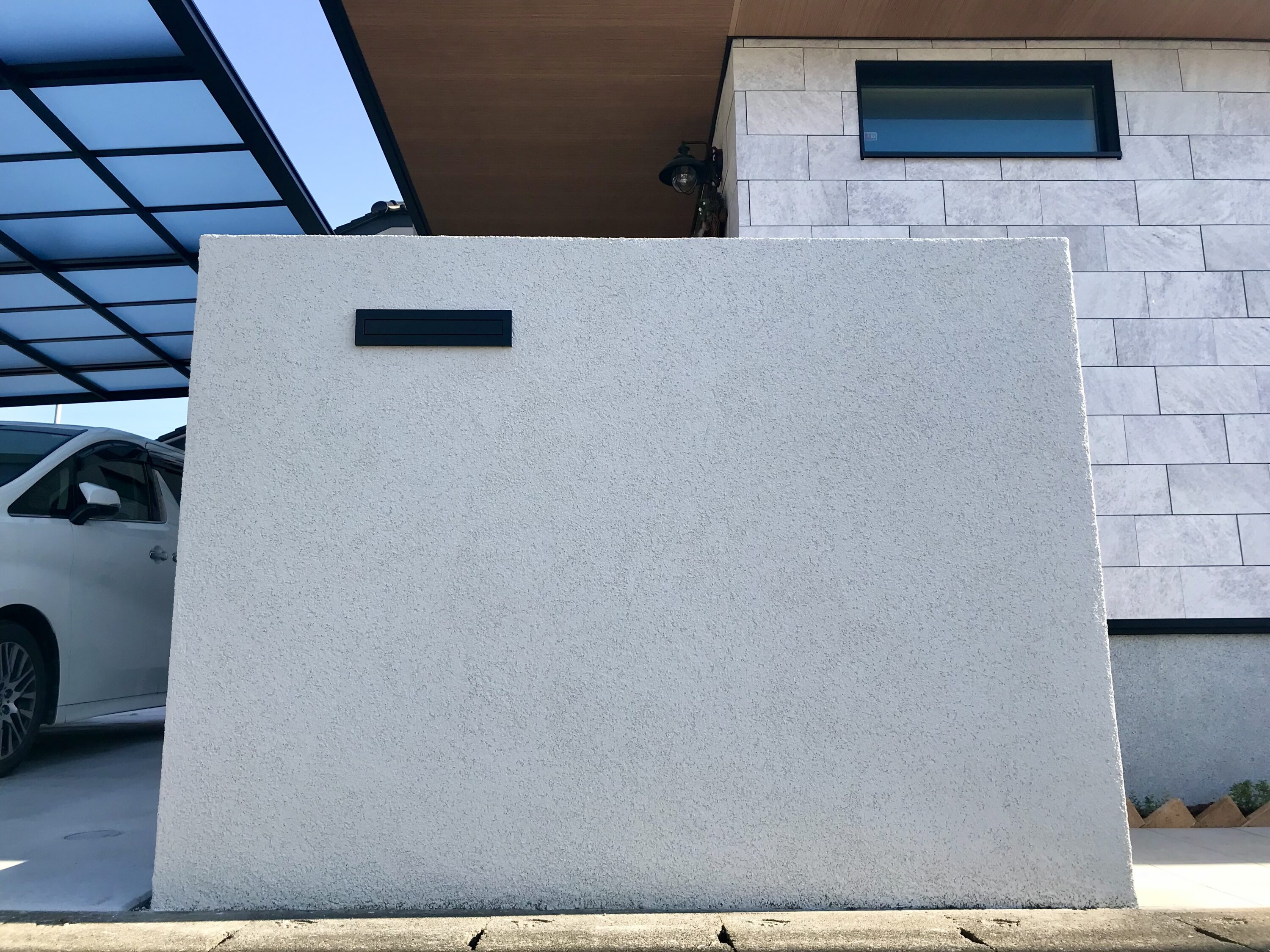 片側支柱のカーポートで使いやすさを重視して、玄関のプライバシーを隠すためにシンプルな大きめの門柱を施工しました。